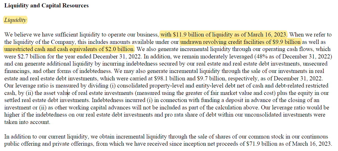 이전 기사에서 보았듯이 BREIT의 10k 공시에서 유동성 관련 내용을 살펴보겠습니다.
